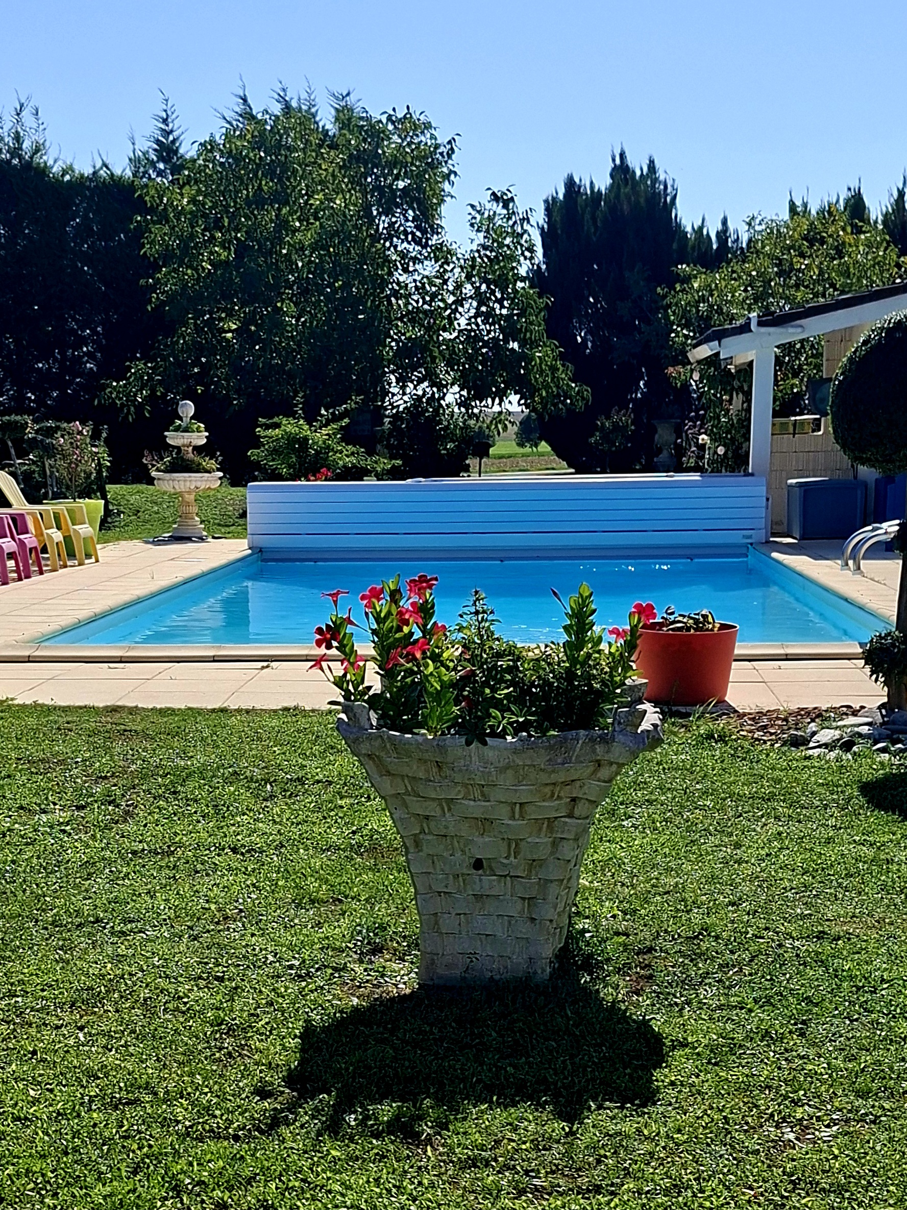 Le matin, vous vous réveillerez avec vue sur le parc arboré et la Piscine chauffée privée sous réglementation (ouverte du 15 Juin au 15 Septembre).